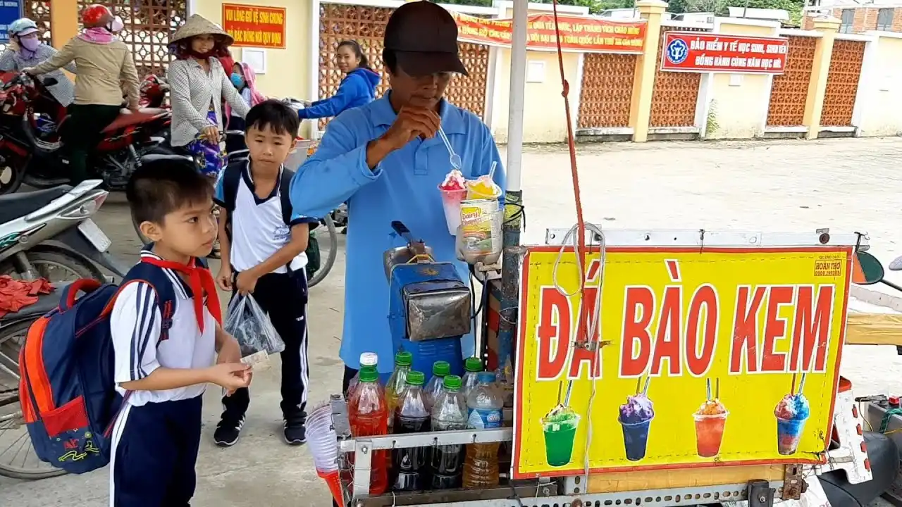 Không cầu kỳ không hoa mỹ, nhưng nó là món ngon không thể bỏ qua của những đứa học trò giữa giờ ra chơi. Tiếng leng keng quen thuộc vang lên, là y như rằng đám nhỏ tụi tui lao ra ngoài cổng trường liền. Đứa nào cũng í a í ới để chọn món, không hề có menu như bây giờ, mà chỉ có bảng màu tươi mát mà thôi. Xanh là bạc hà, đỏ là vị dâu thơm lừng hay vàng là vị cam chua chua.